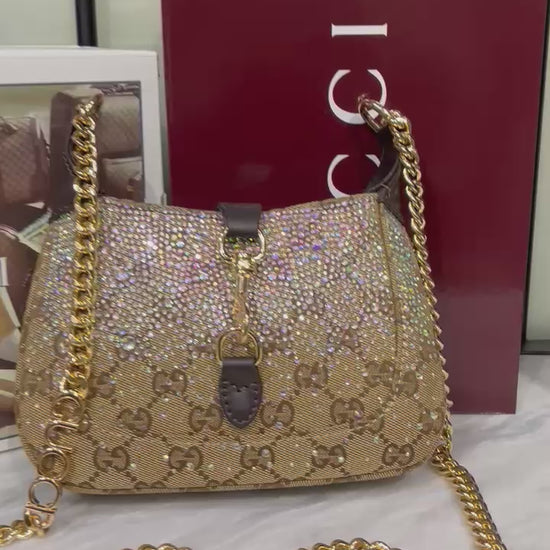 The Gucci Jackie Notte Mini Bag captures the house’s timeless elegance with a touch of modern sparkle. Crafted in signature beige and dark brown GG canvas, it’s adorned with gradient-effect crystals that shimmer beautifully under any light — making it the perfect evening statement piece.