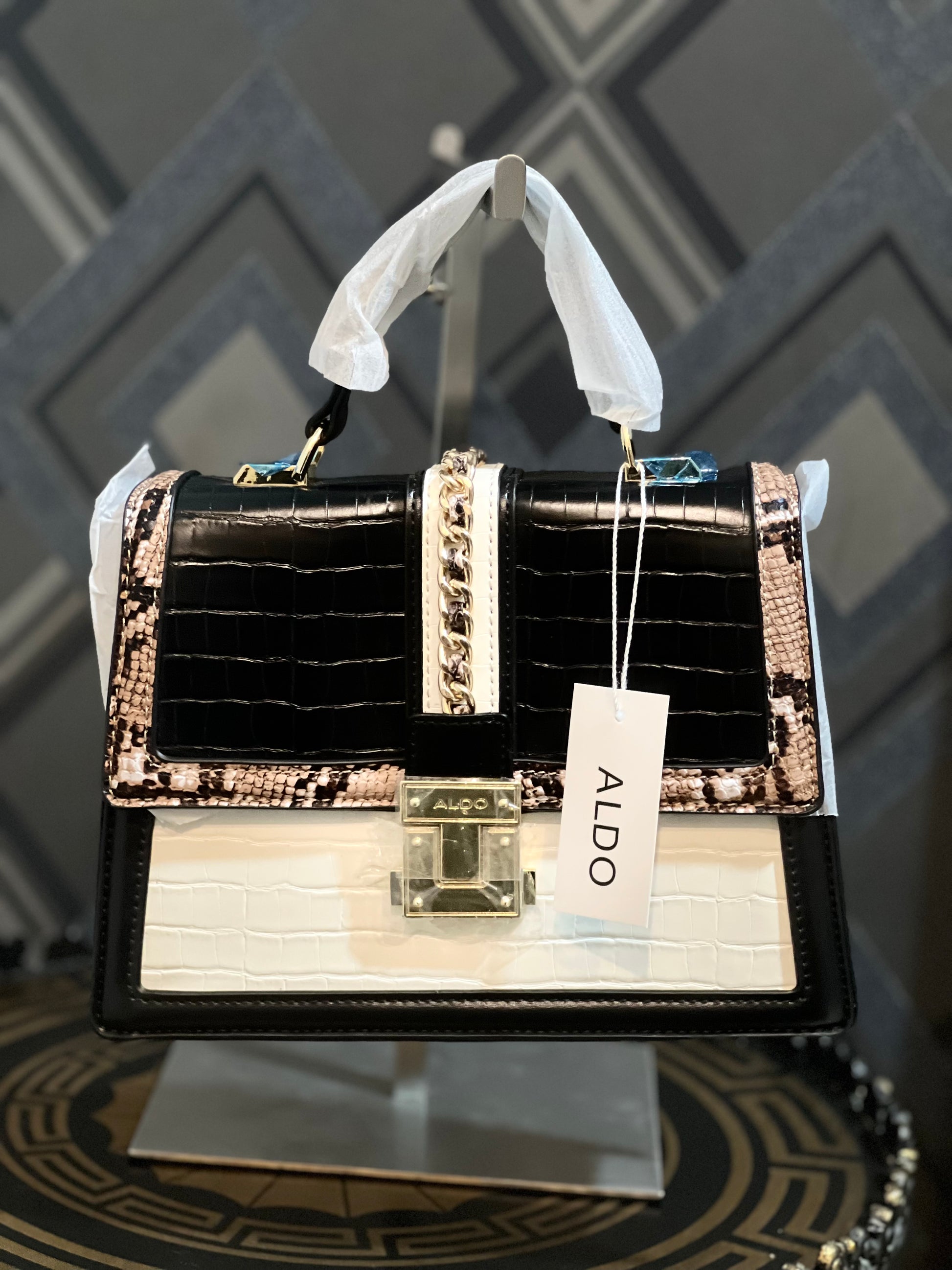 The ALDO Martissa Top Handle Bag blends modern style with everyday functionality. Designed with a structured silhouette, it features a top handle, front flap with push-lock closure, and elegant gold-tone hardware accented by a decorative chain detail. Crafted from high-quality synthetic materials, this bag offers a polished look without compromising durability.